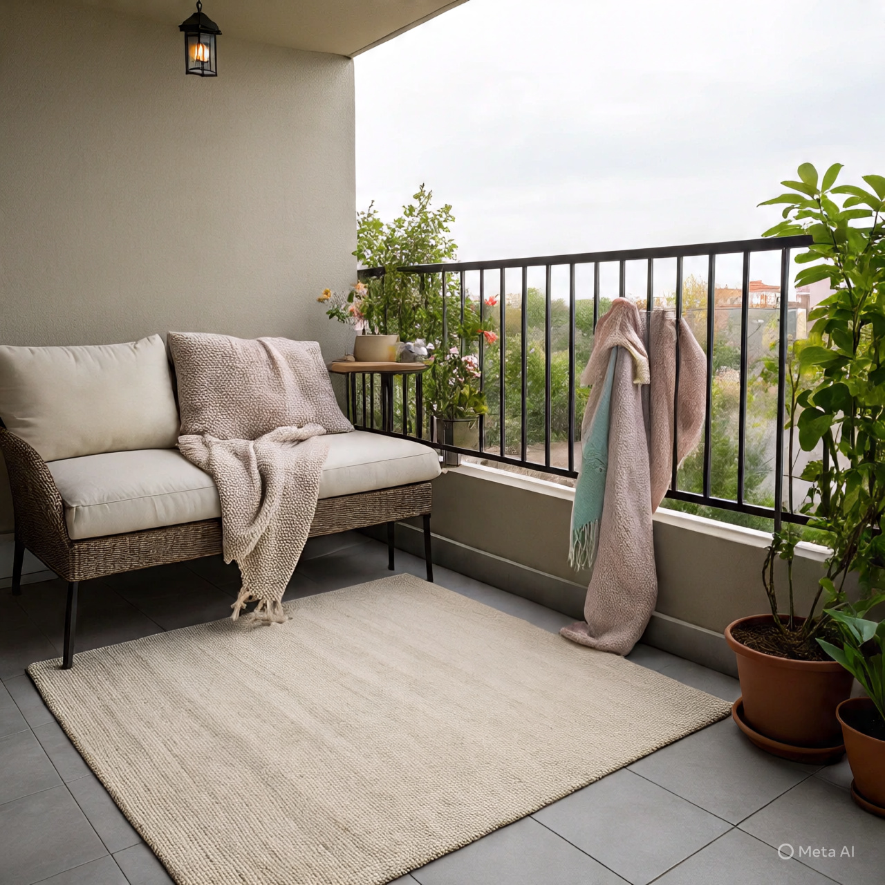 Small balcony ideas enhanced with outdoor rugs and soft textiles