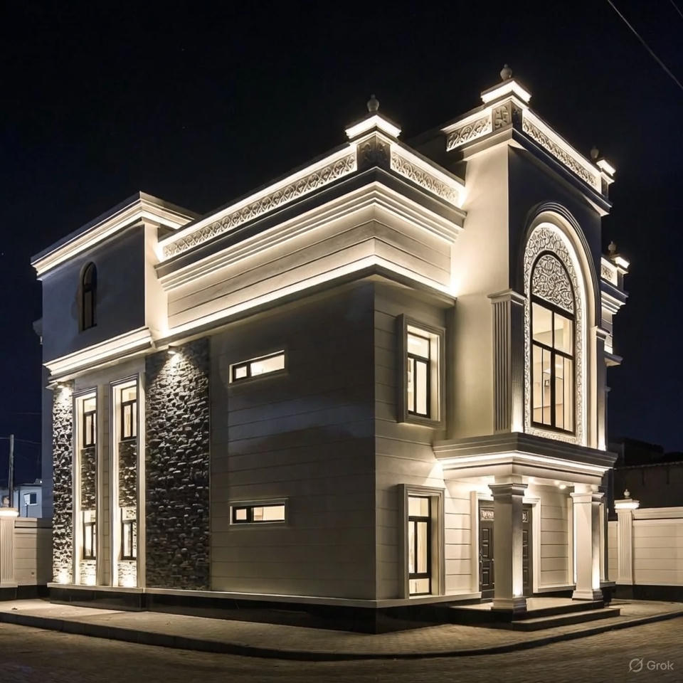 Soft, warm LED strip lights along edges, textures, or balcony undersides highlight architectural features and make a small elevation glow beautifully at night.